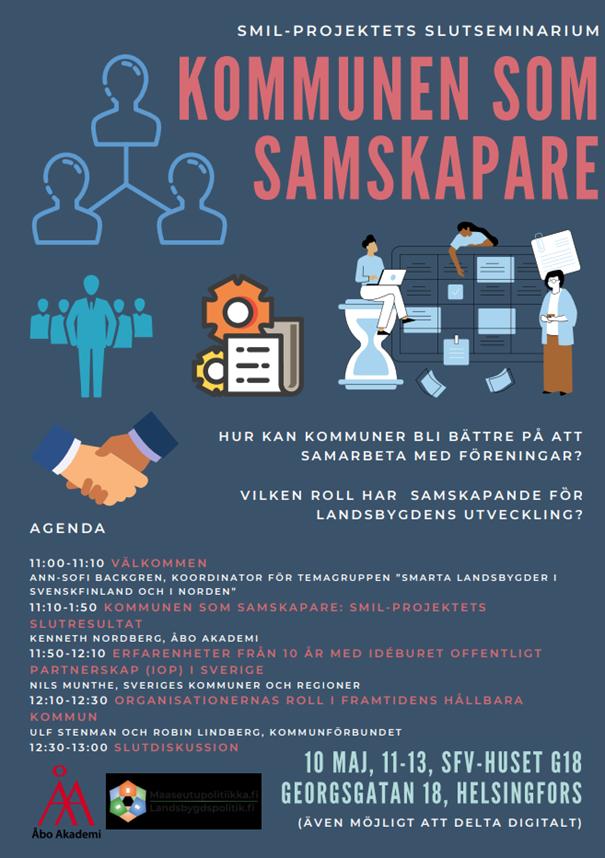Kom med på slutseminariet för Åbo Akademis forsknings- och utvecklingsprojekt SMIL (Svenska modeller för sociala innovationer i landsbygdsutveckling) den 10 maj kl. 11-13 i SFV-huset G18 i Helsingfors och hör mer. Även representanter för Sveriges kommuner och regioner, samt Finlands Kommunförbund deltar.