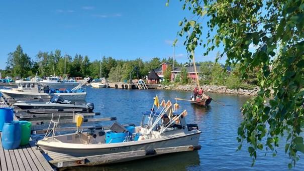 Nordstjärnan anlöper hemkajen vid Brännskata 3.7.2022 efter returseglingen från Holmön och årets Postrodd som ägde rum 2.7.