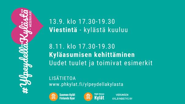 Den 13 september kl. 17.30-19.30 fortsätter webbinarieserien Ylpeydellä kylästä (Stolt över byn) med det tredje webbinariet som denna gång behandlar byakommunikationen, Viestintä – kylästä kuuluu. Det utlovas tre anföranden med idéer om att utveckla byakommunikationen. Kvällens huvudtalare är företagaren och marknadstrategen Varpu Rusila. Hon avslöjar under webbinariet hur en tavastlänning med en skokartongs budget och systematiskt arbete kan få till stånd ett budskap som redan i år har nått internationellt över 7 miljoner människor.