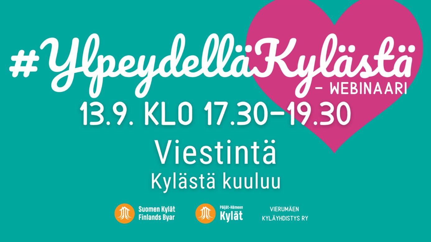 Den 13 september kl. 17.30-19.30 fortsätter webbinarieserien Ylpeydellä kylästä (Stolt över byn) med det tredje webbinariet som behandlar byakommunikationen, Viestintä – kylästä kuuluu. Det utlovas tre anföranden med idéer om att utveckla byakommunikationen.