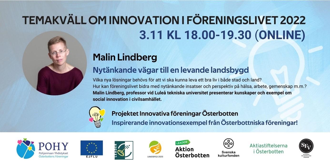 Vilka nya lösningar behövs för att vi ska kunna leva ett bra liv i både staden och på landet? Hur kan föreningslivet bidra med nytänkande insatser och perspektiv på hälsa, arbete, gemenskap m.m.? Under rubriken Nytänkande vägar till en levande landsbygd presenterar Malin Lindberg, professor vid Luleå tekniska universitet, kunskaper och exempel om social innovation i civilsamhället. Vi får även ta del av inspirerande innovationsexempel från österbottniska föreningar – ungdomslokal.fi, en gemenskap för unga på nätet och omställning i Älvbyarna.