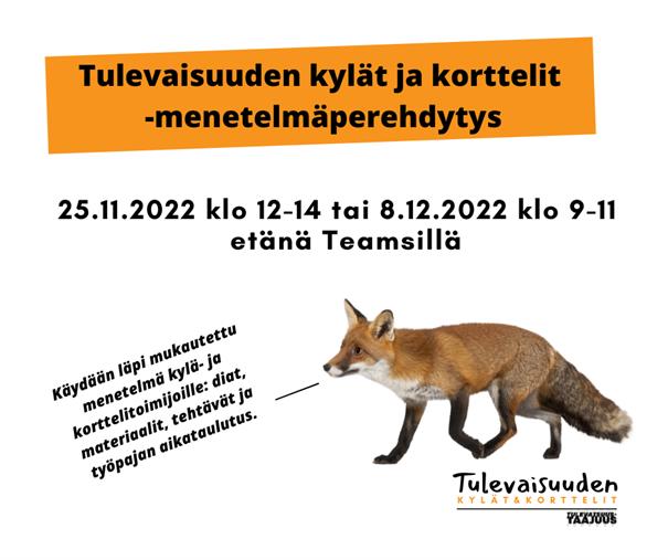 Inom projektet Framtidens byar och stadsdelar, Tulevaisuuden kylät ja korttelit-projekti, som finansierats av Sitra, har metoden Framtidsfrekvensen-workshoppar, Tulevaisuustaajuus-työpajaa, anpassats för användning i byar och stadsdelar. Framtidsfrekvensen är en workshopmetod för att skapa annorlunda framtider. I genomgången av materialet får du höra hur metoden har modifierats och var materialen finns. Två webbinarier med samma innehåll ordnas den 25 november kl. 12-14 (anmälan) och 8 december kl. 9-11 (anmälan).