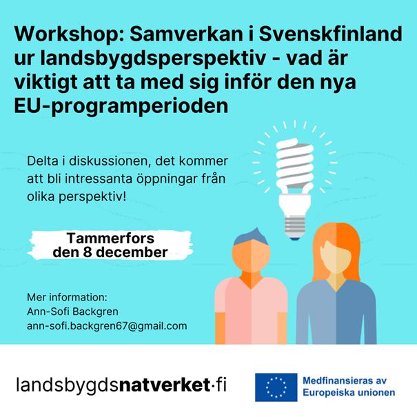 Arrangör och moderator för ”framtidsworkshopen” är Ann-Sofi Backgren, samordnare för den svenska temagruppen vid Landsbygdsnätverket ”Smarta landsbygder i Svenskfinland och i Norden”.