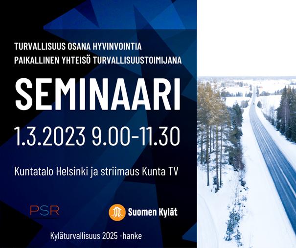 Byatrygghetsprojektet Kyläturvallisuus 2025 håller slutseminarium 1.3 kl. 9-11.30 på Kommunhuset, Andra linjen14, 00530 Helsingfors. Man kan delta i seminariet på plats eller via Kunta TV:s livesändning. Temat för seminariet och paneldiskussionen är ”Tryggheten som en del av välbefinnandet och lokalsamhället (byar och stadsdelar) som en trygghetsaktör”.