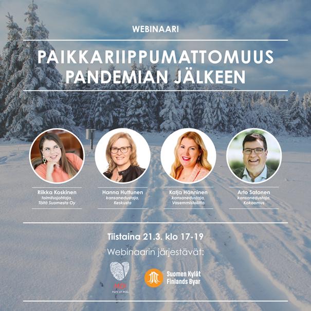 Coronan förändrade vår uppfattning om arbetet knutet till en plats. Hur ser situationen ut för platsoberoende arbete och de möjligheter det skapar? Webbinariet, som hålls 21.3 kl. 17-19 via Teams, upptar en paneldiskussion där man bl.a. funderar på behovet av att skapa en strategi för distansarbete i Finland. Vilka skulle vara dess fördelar och vad krävs för att skapa den? Hur gynnar platsoberoende arbete företag och är det en konkurrensfaktor? Är platsoberoendet svaret på arbetskraftsbristen?