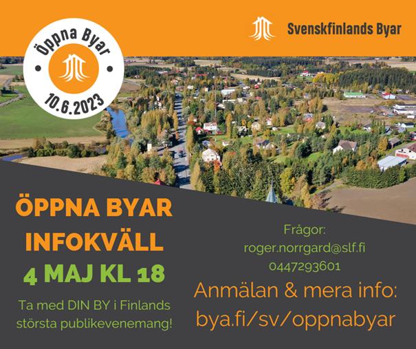 Anmälan till infotillfället på svenska 4 maj: http://www.bya.fi/sv/oppnabyar. Officiell sida för Öppna Byarnas dag (på finska): https://suomenkylat.fi/ajankohtaista/tapahtumat/avoimet-kylat.