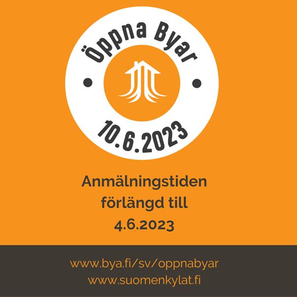 Ännu hinner du anmäla ert evenemang till Öppna Byarnas dag, www.bya.fi/sv/oppnabyar. Anmälningstiden har förlängts till 4 juni. Se kartan på de hundratals evenemang som redan är med i Öppna Byarnas dag den 10 juni, https://suomenkylat.fi/ajankohtaista/tapahtumat/avoimet-kylat.