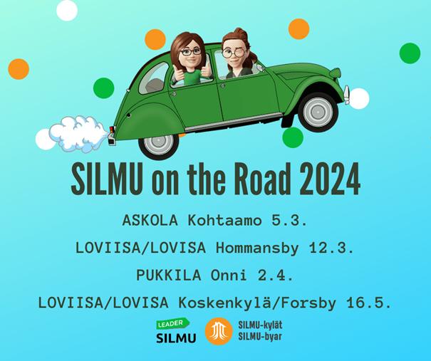 Förra årets SILMU on the Road-turné fick ett positivt gensvar, och Utvecklingsföreningen SILMU rf genomför den även i år. Syftet med kommun- och byarundan är att informera invånarna i vårt verksamhetsområde om Leader-finansiering, byatjänster och nya utvecklingsprojekt. Både projekt- och byarådgivaren deltar bland annat i byakvällar och andra evenemang som kommunerna ordnar året runt. De som vill kan också kontakta oss och be att turnén stannar i den egna byn.