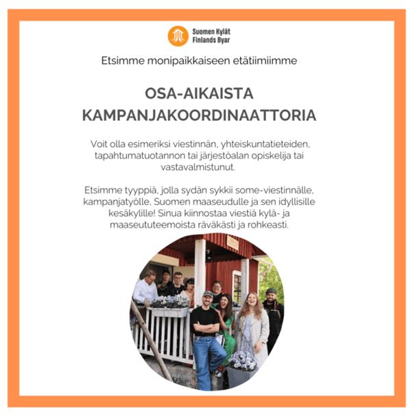 Kampanjkoordinatorn planerar, assisterar och genomför arbetspaketen för EU-kommunikationsprojektet Kyläläiset EU-päättäjiksi 2024 och för Finlands Byars kommunikations- och påverkanskampanjer. Anställningstiden är 15.4-30.9.2024 eller enligt överenskommelse och lönen 60 % av 2 800 euro eller 1 680 euro/månad. Kampanjkoordinatorn arbetar ungefär tre dagar i veckan eller med förkortad arbetstid Arbetet är i huvudsak distansarbete, men kräver en del resande. Anledningen till visstids- och deltidsarbete är projektfinansiering. Ansökan lämnas in elektroniskt på adressen rekry@suomenkylat.fi senast 7.4 kl. 21.00.