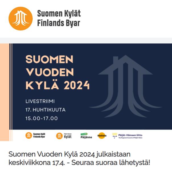 Välkomna att i direktsändning följa utnämningen av Årets by på riksplanet. Tillställningen sänds på Youtube 17.4 i slutet av en tå timmars livesändning under Byadagarna i Hollola 17-18.4. Mer om programmet finns i Finlands Byars senaste nyhetsbrev som innehåller bland annat detta: