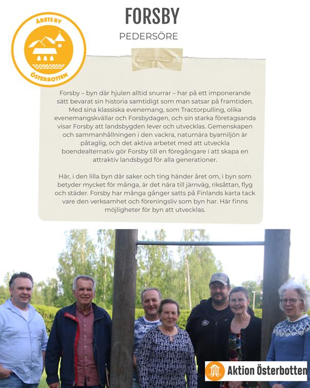 Forsby i Pedersöre är Årets by i Österbotten. Juryn som bestod av representanter från Aktion Österbotten och Österbottens förbund, motiverade valet så här: