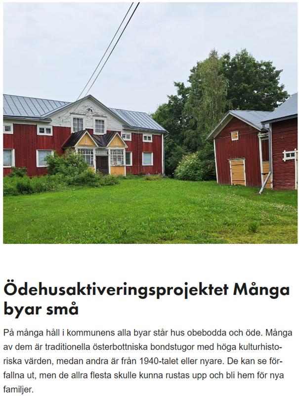 Det tvååriga projektet ”Många byar små” i Korsholm jobbar för att gamla ödehus ska komma till användning. Halvvägs in i projektet finns det för tillfället tolv ödehus till salu i kommunen. Genom projektet ska Korsholms kommun föra samman husägare och köpare och efter att de hittat en matchning, sköter ägaren och köparen affären separat, utan kommunen. Projektledare Ruusa Viljanen Rossi säger att den processen lämnar vi helt över till det privata,